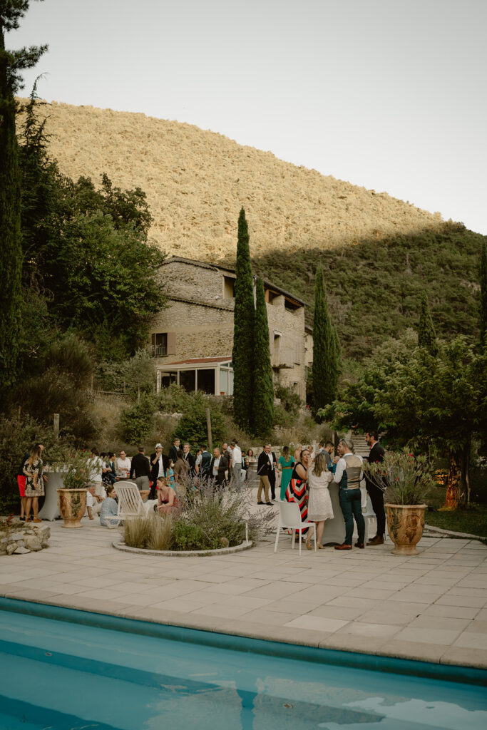 Une fois le « oui » prononcé, la douceur se poursuit naturellement autour de la grande piscine du domaine. Le soleil commence doucement à décliner, les montagnes prennent cette teinte rose qui appartient uniquement au sud, et les invités se laissent porter par la convivialité du moment. On trinque, on rit, on respire encore un peu cet air qui sent les vacances et la fête.