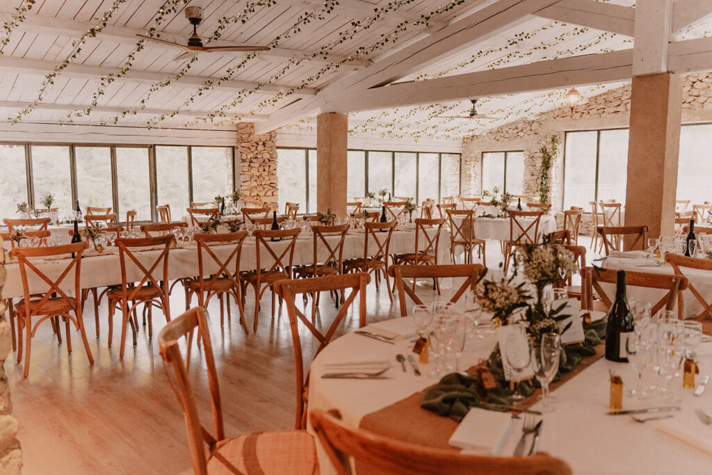 Pour la soirée, direction la grande salle de réception du Hameau : 220 m² de pierre et de lumière. Les grandes baies vitrées offrent une vue sur la vallée, tandis que les murs en pierre apparente rappellent les mas d’antan. L’espace peut accueillir jusqu’à 144 convives confortablement installés.