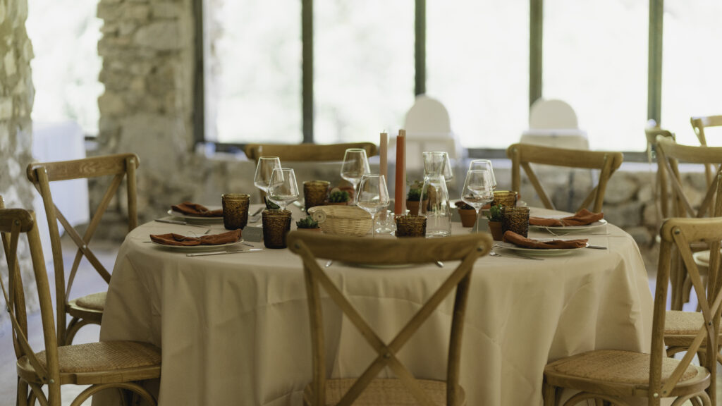C’est cette variation infinie qui donne tant de vie au domaine. Depuis la salle de réception, les baies vitrées ouvrent sur les montagnes environnantes, créant comme un tableau vivant qui accompagne votre soirée. On dîne devant un panorama qu’aucune décoration artificielle ne pourra jamais égaler, et ce sentiment d’être coupés du monde, entourés de nature, donne au mariage une dimension presque cinématographique.